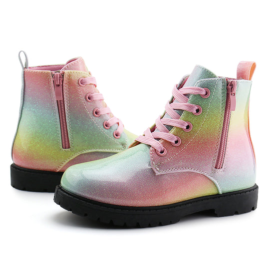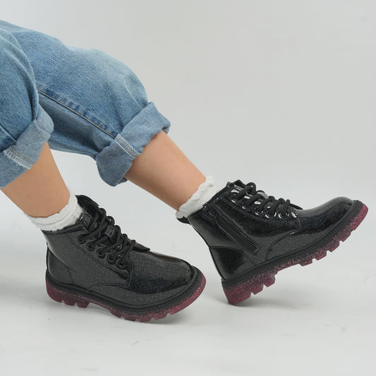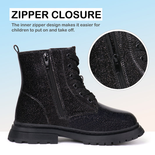 Girls Glittery Ankle Boots Kids Lace Up Combat Boots with Side Zipper